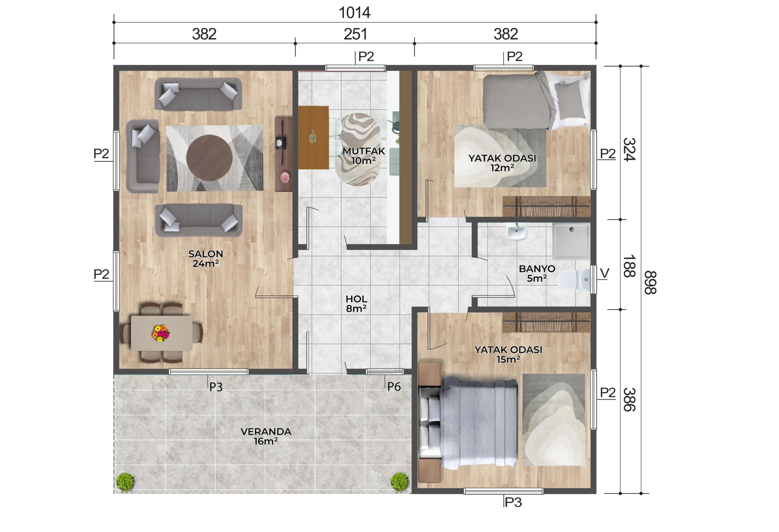 - Ahşap desenli Betopan dış cephe, doğal bir görünüm sunarak modern ve şık bir dış alan yaratır.