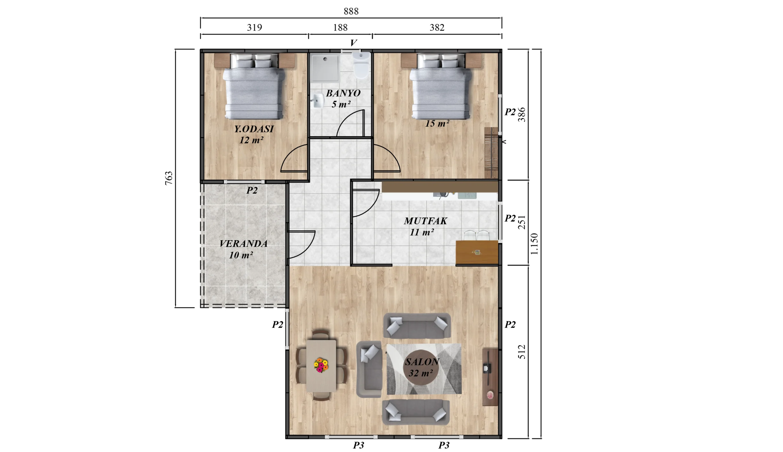2+1 Tek Katlı Prefabrik Ev 77 m²