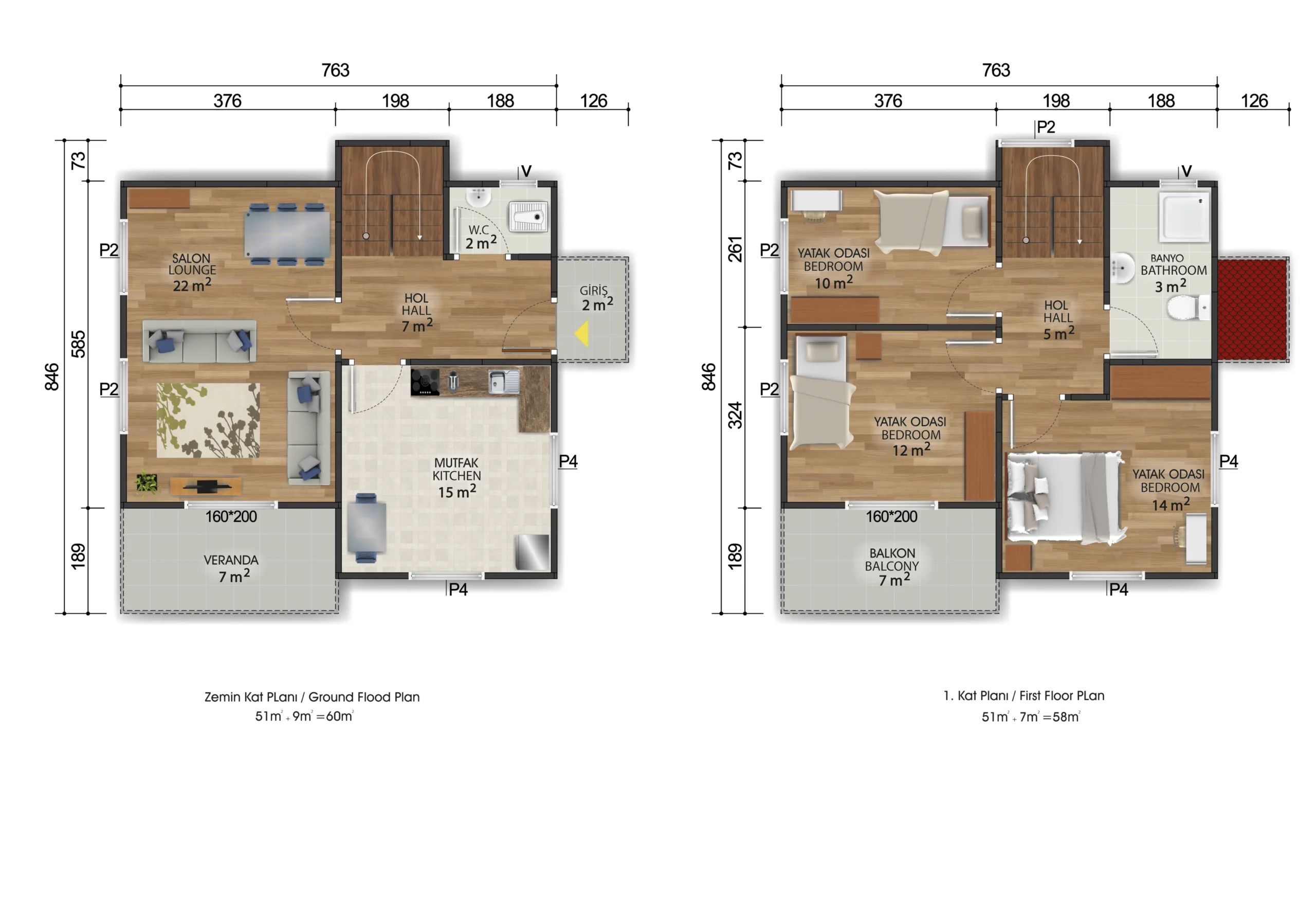 2+1 Çift Katlı Prefabrik Ev 92 m²