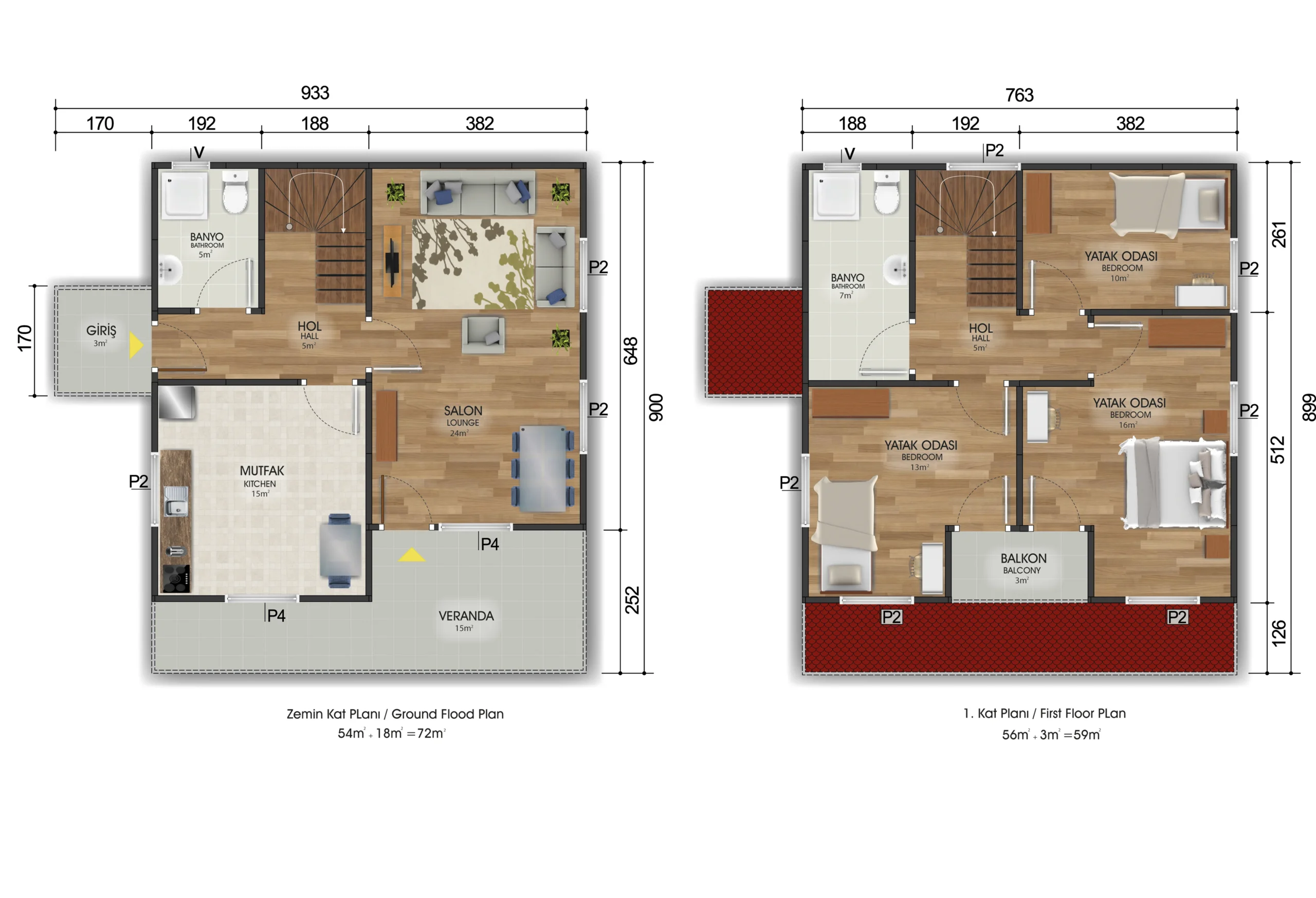 3+1 Çift Katlı Prefabrik Ev 131 m²