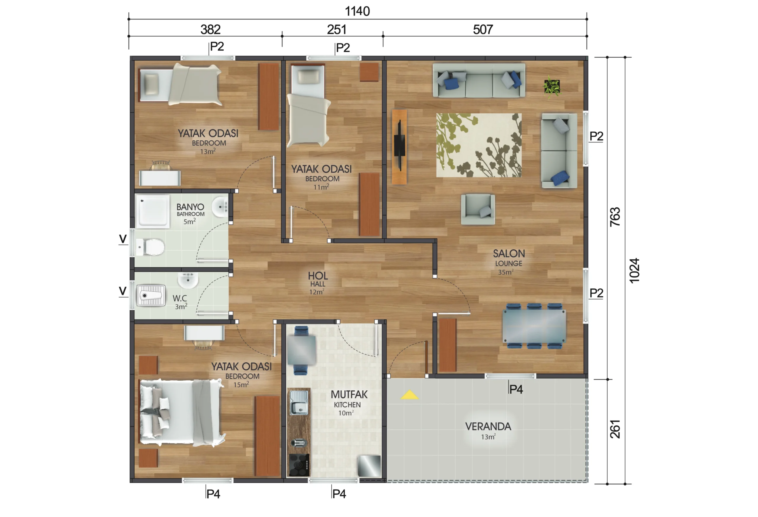- 3 yatak odası ve 1 salon ile geniş aileler için konforlu bir yaşam alanı sunar.