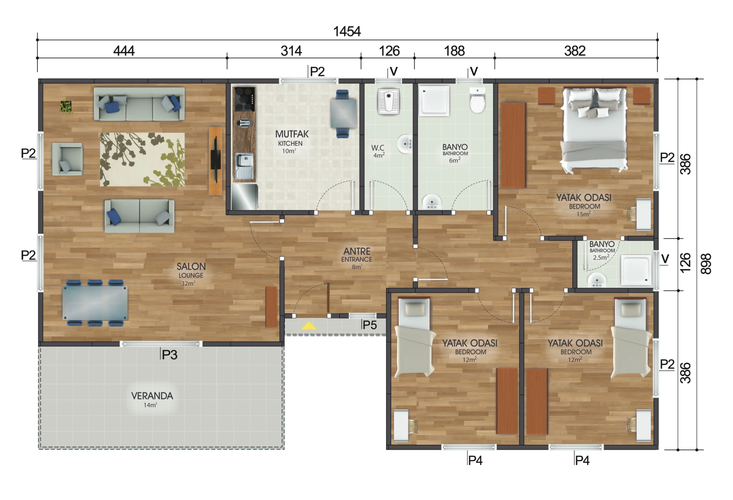 - 3+1 Oda Düzeni: Ferah salon, 3 yatak odası ve 2 banyo ile rahat kullanım imkanı.