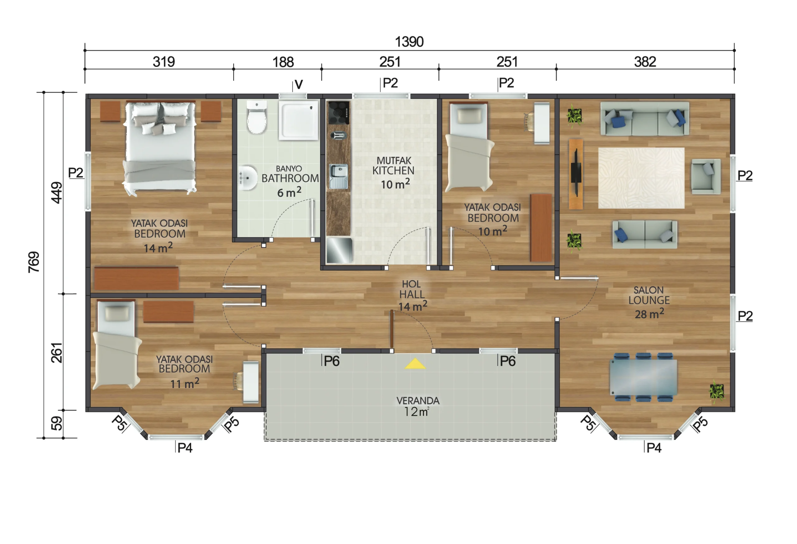 İç duvarlar 6 cm, dış duvarlar ise 10 cm kalınlığında olup, mükemmel ısı yalıtımı sağlar. Bu sayede hem kışın sıcak, hem de yazın serin bir ortam sağlanır. - Sıva Altı Elektrik ve Sıhhi Tesisat: