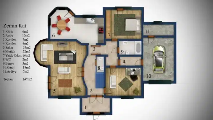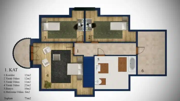 5 oda + geniş salon: Büyük aileler için geniş yaşam alanı.